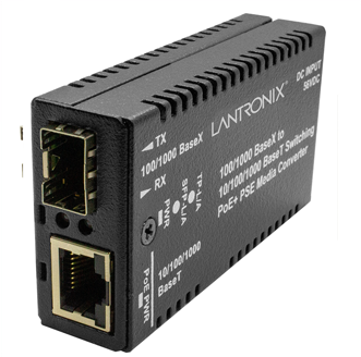 産業用環境に適したPoE-PD(受電)対応の10/100/1000Base-TからSFPトランシーバモジュール(100Mまたは1000M)光ファイバ・メディアコンバータは電源ラインをPoEハブから給電可能なため、電源不要
