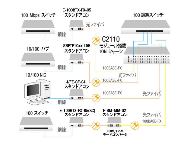 「C2110-1011」、「C2110-1013」、「C2110-1039」は、100BASE-TXイーサネット銅線と100BASE-FX 2心マルチモード光ファイバへ変換、「C2110-1014」、「C2110-1019」は2心シングルモード光ファイバへ変換し最長20km伝送可能なIONプラットフォームでカード型のメディアコンバータです。