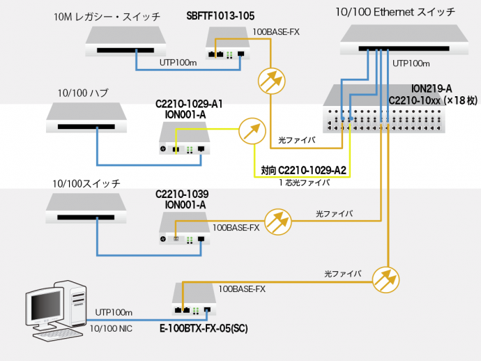 - 10/100BASE-TX (RJ-45) [100 m] ⇔ 100BASE-FX 100BASE-FX 1310nm シングルモード (SC)[20km]